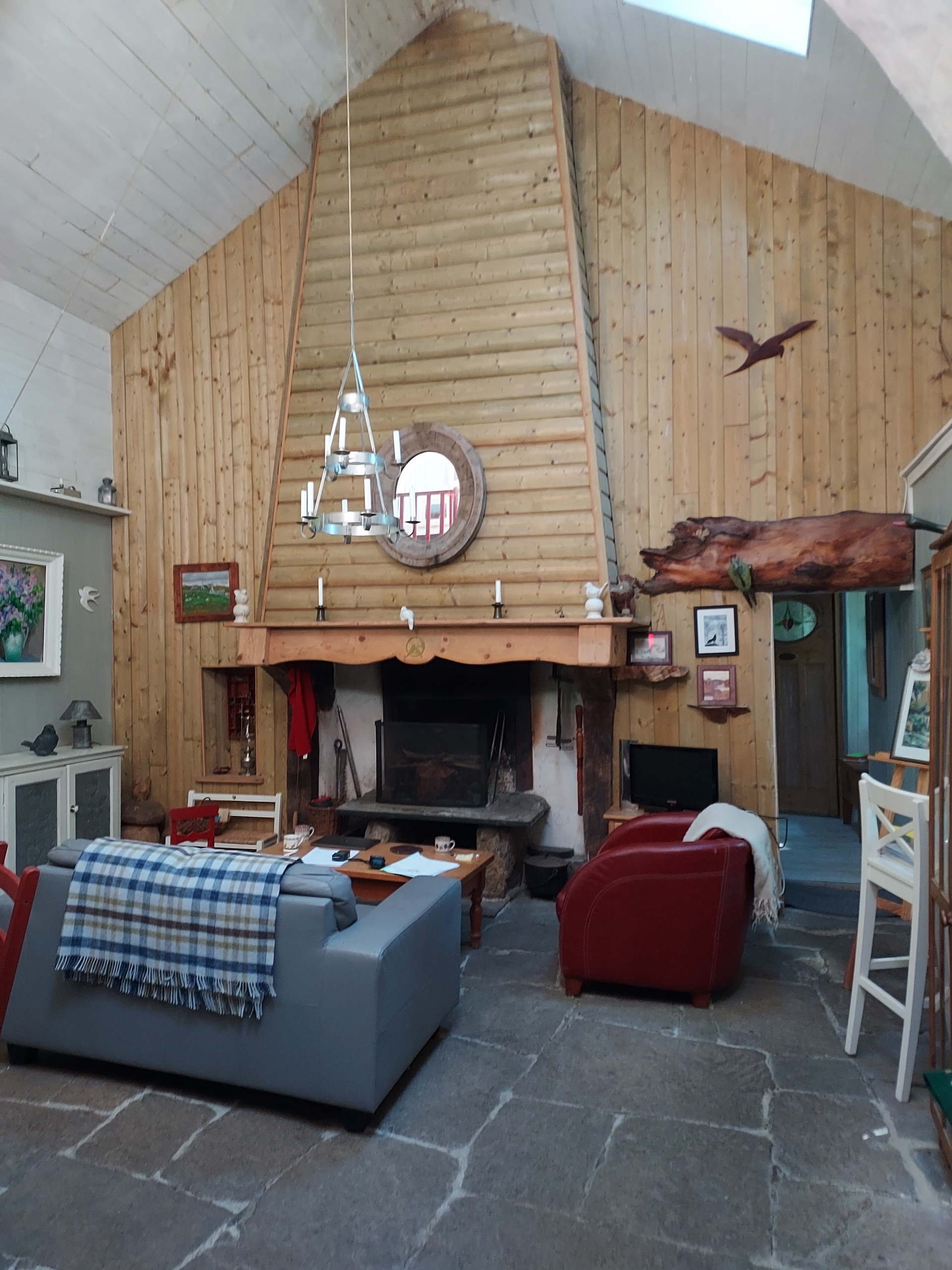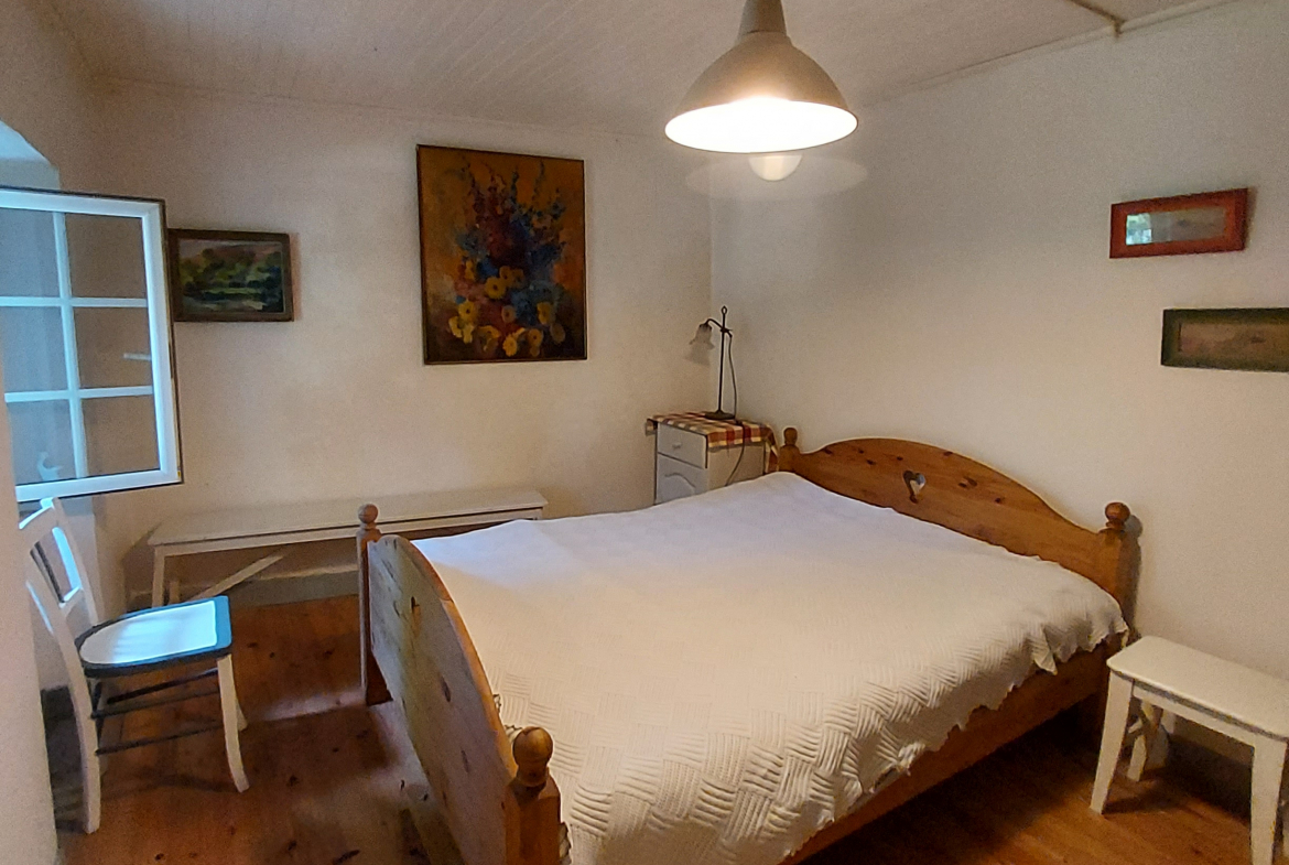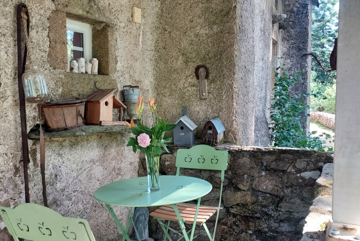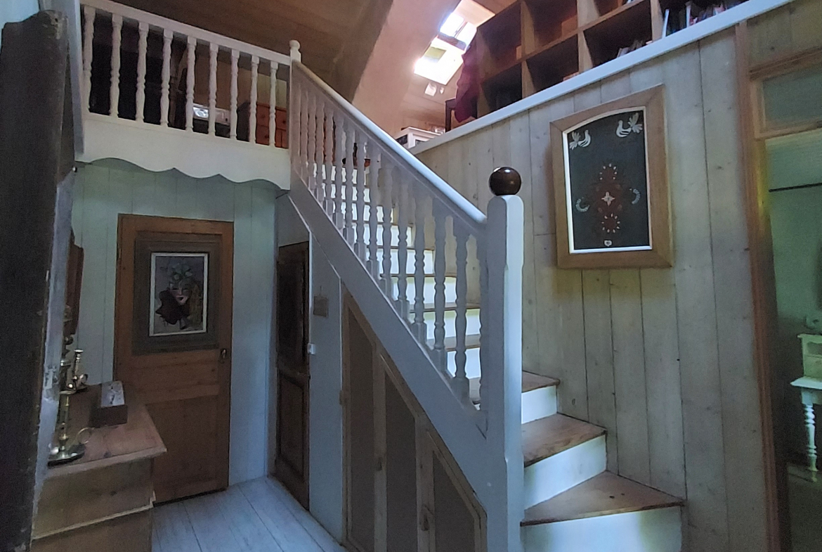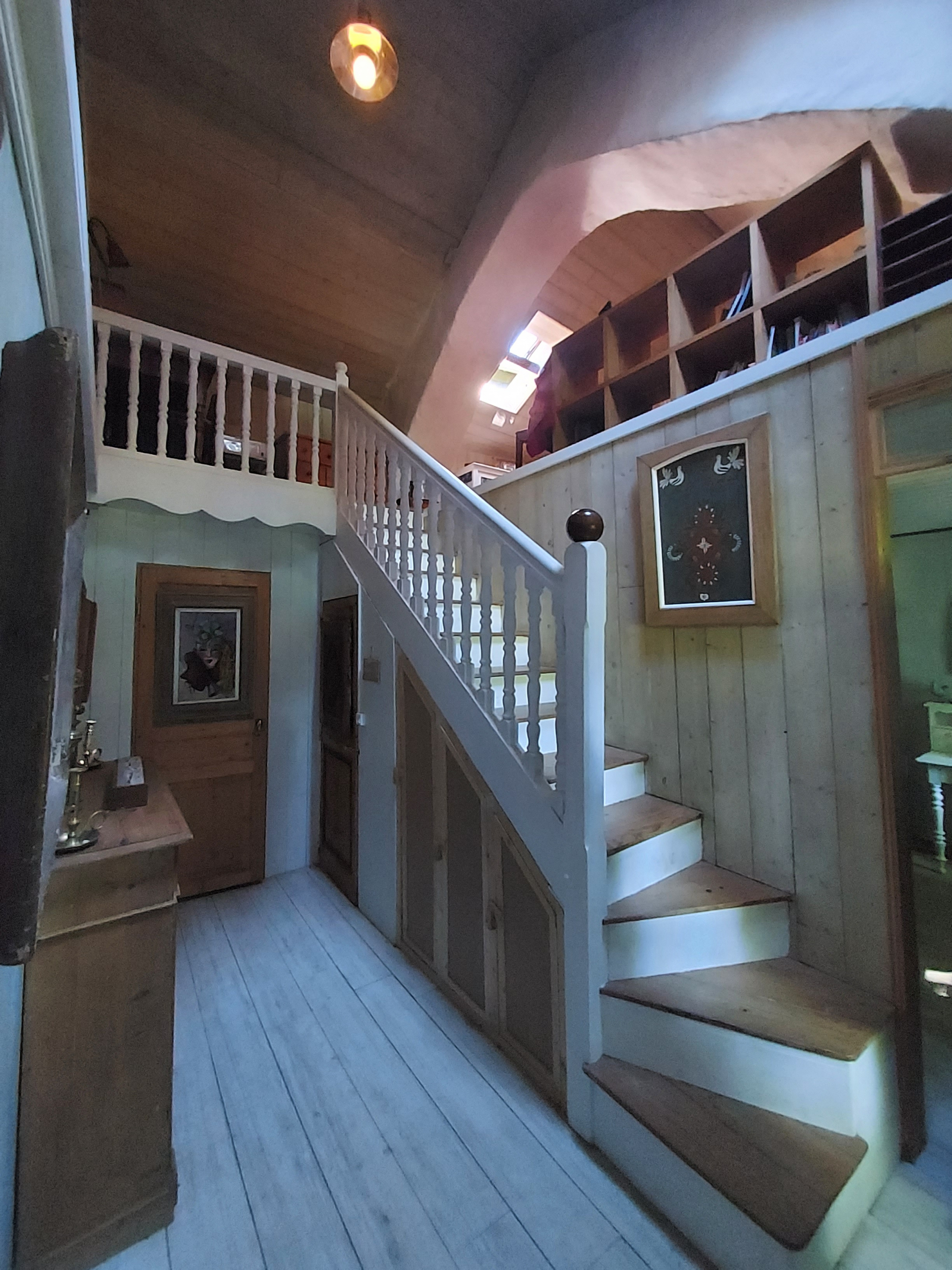 Pour la première partie, rénovée, un joli auvent donnant une pièce de vie avec cheminée offrant de beaux volumes, une cuisine équipée très ajourée. Côté nuit ; WC, grande salle d’eau avec dressing, et au-dessus, une chambre.