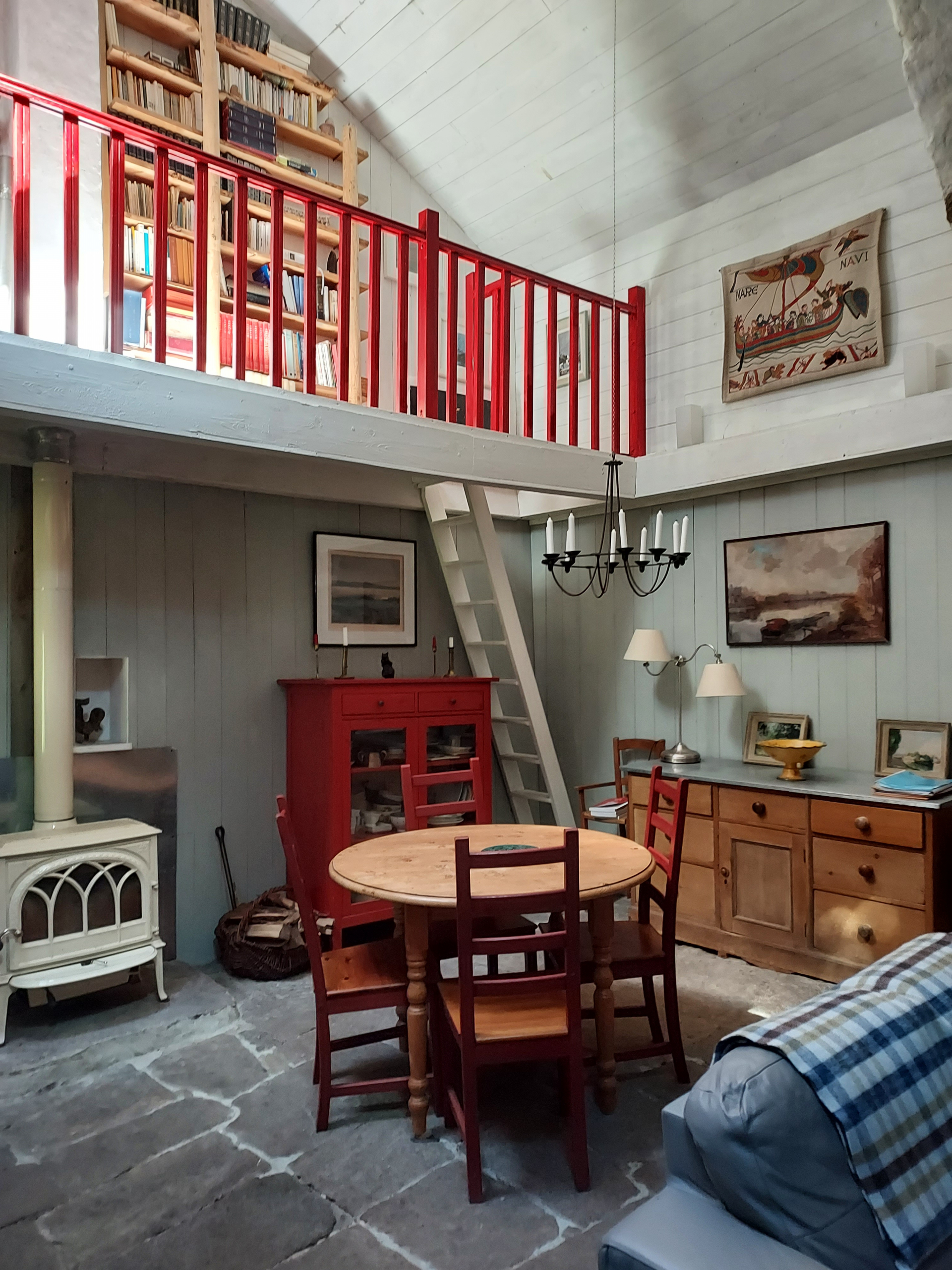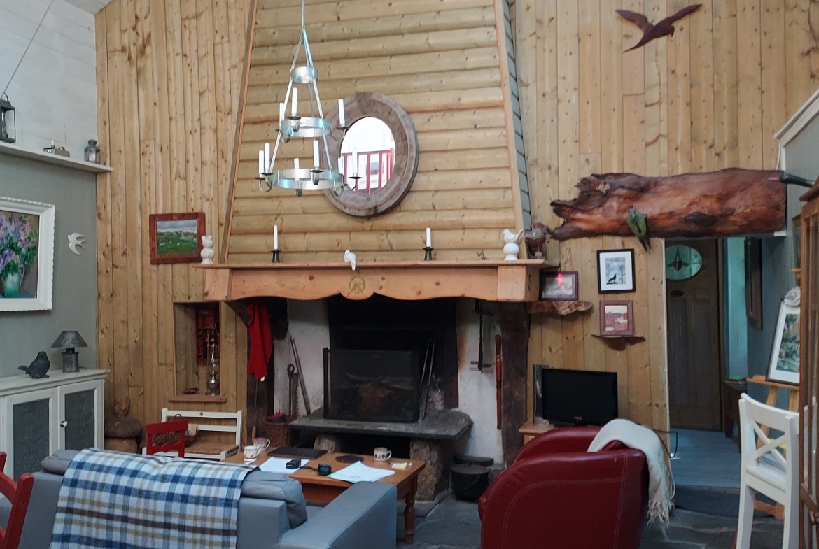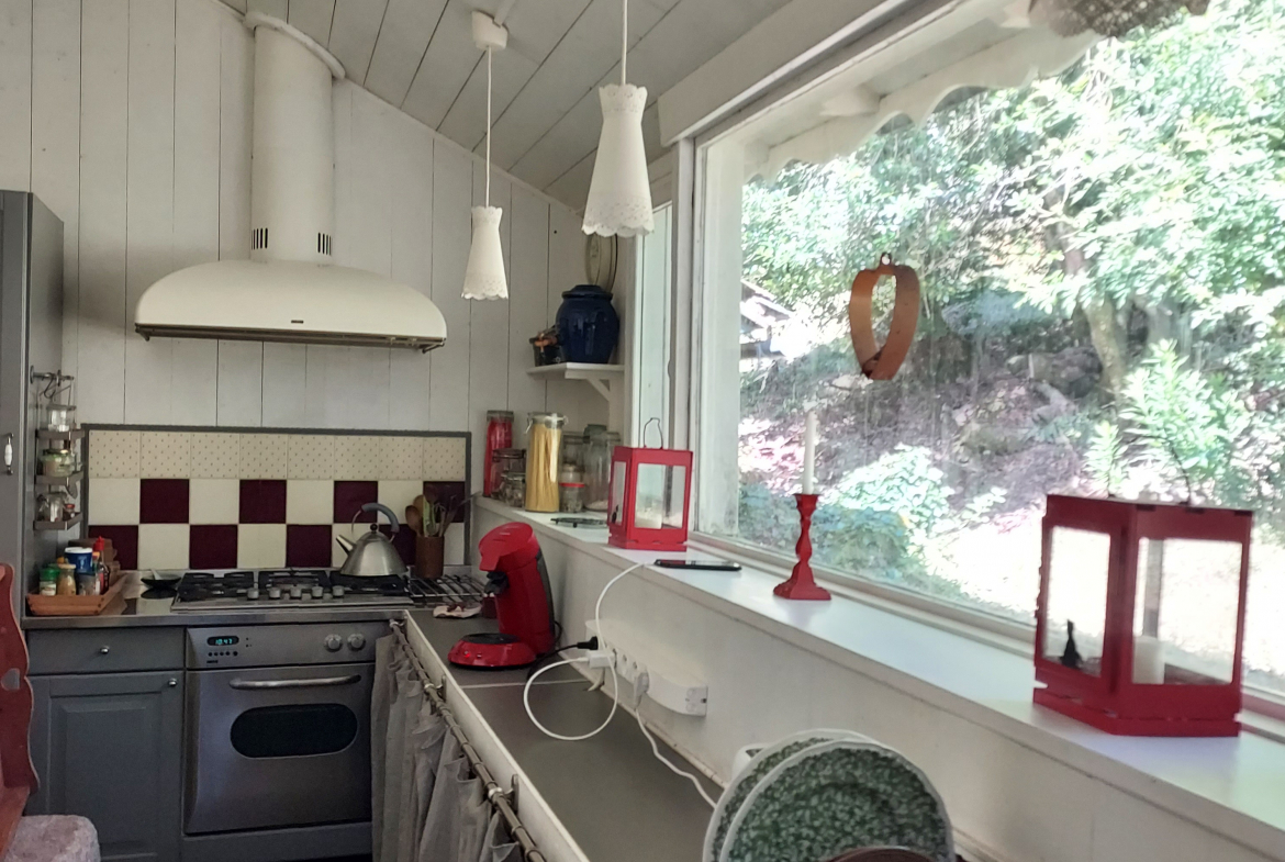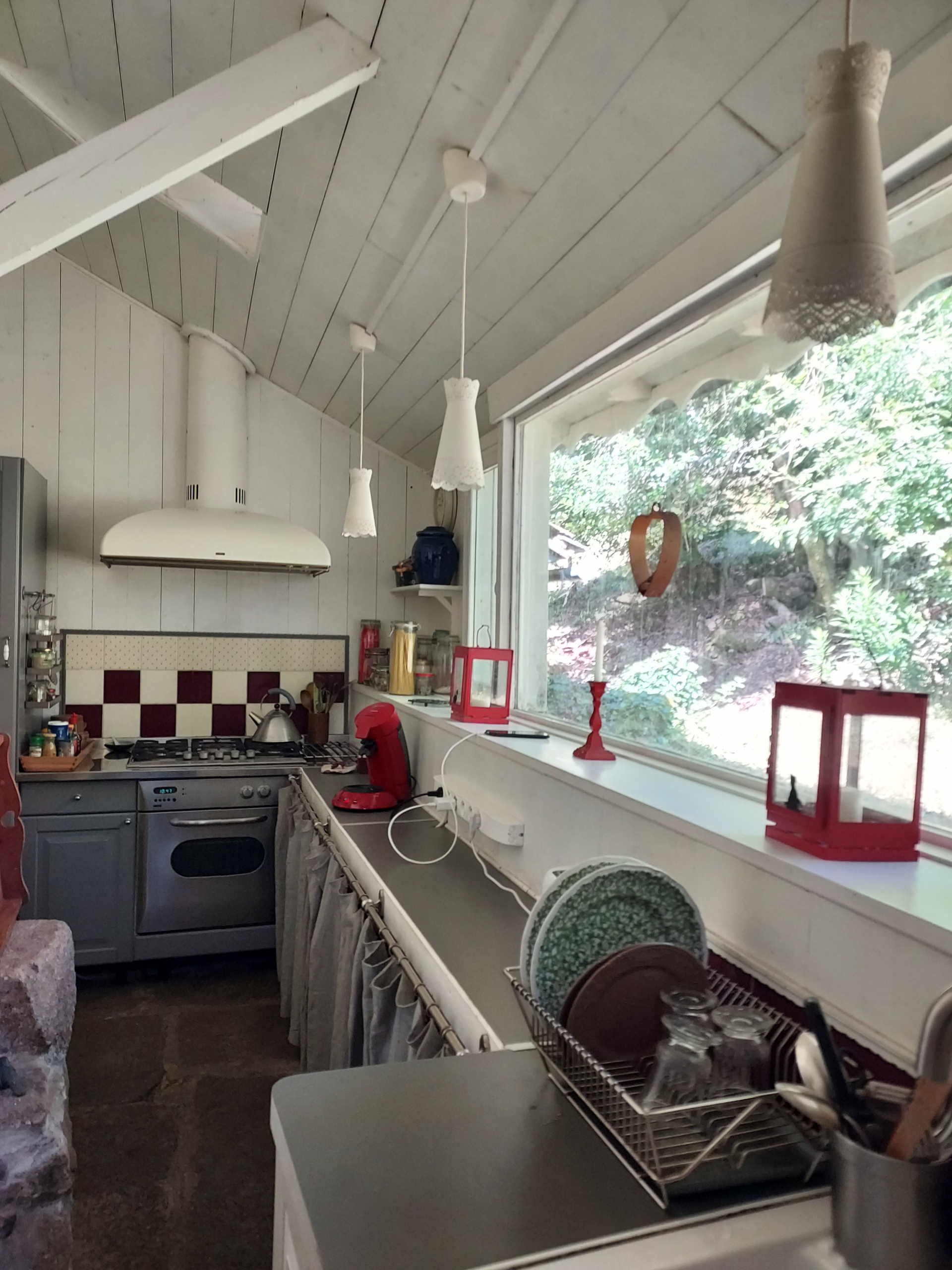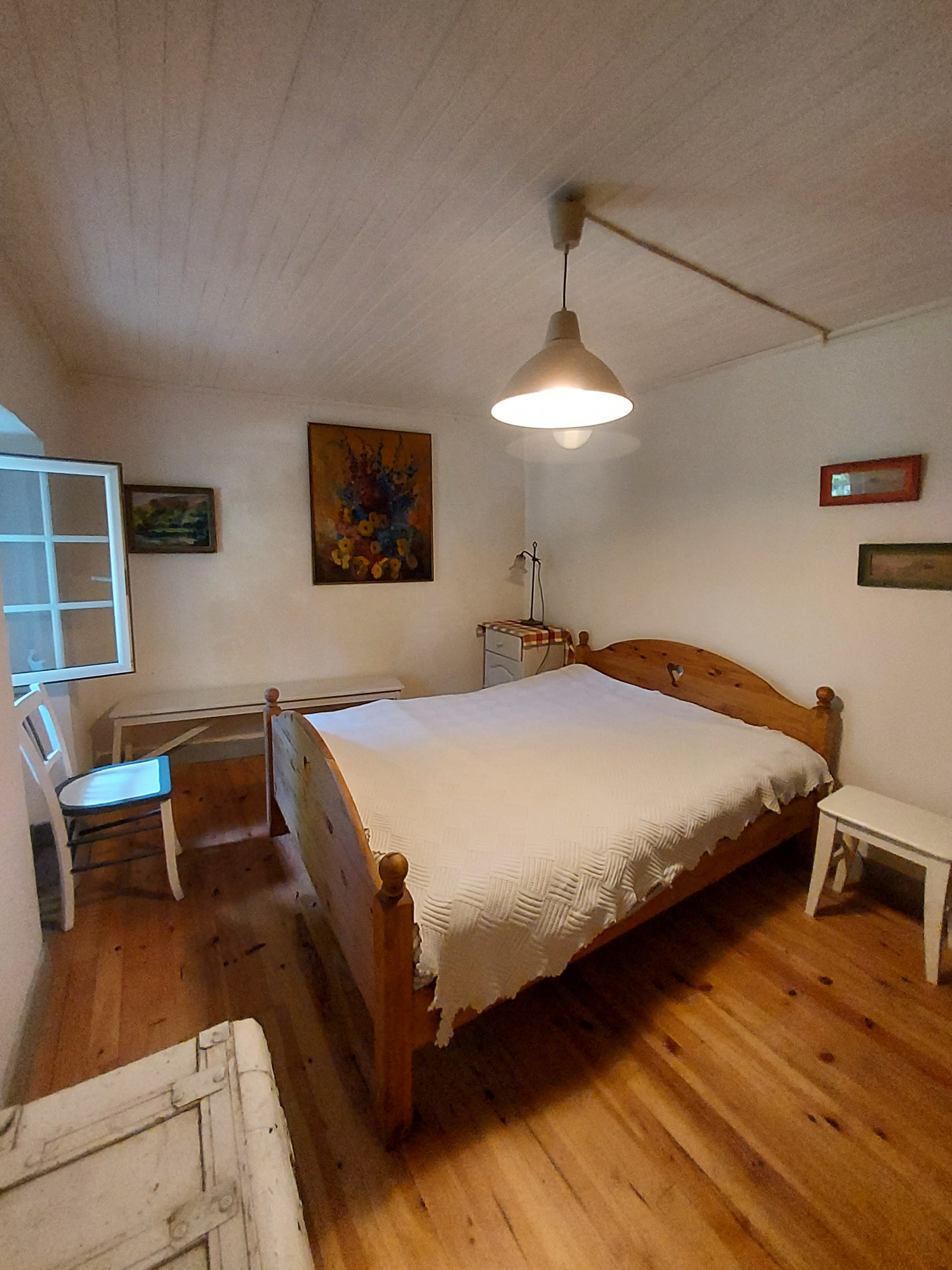 Pour la première partie, rénovée, un joli auvent donnant une pièce de vie avec cheminée offrant de beaux volumes, une cuisine équipée très ajourée. Côté nuit ; WC, grande salle d’eau avec dressing, et au-dessus, une chambre.