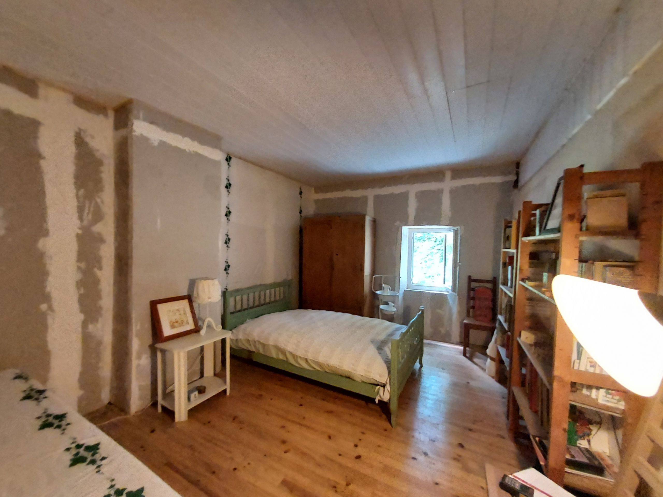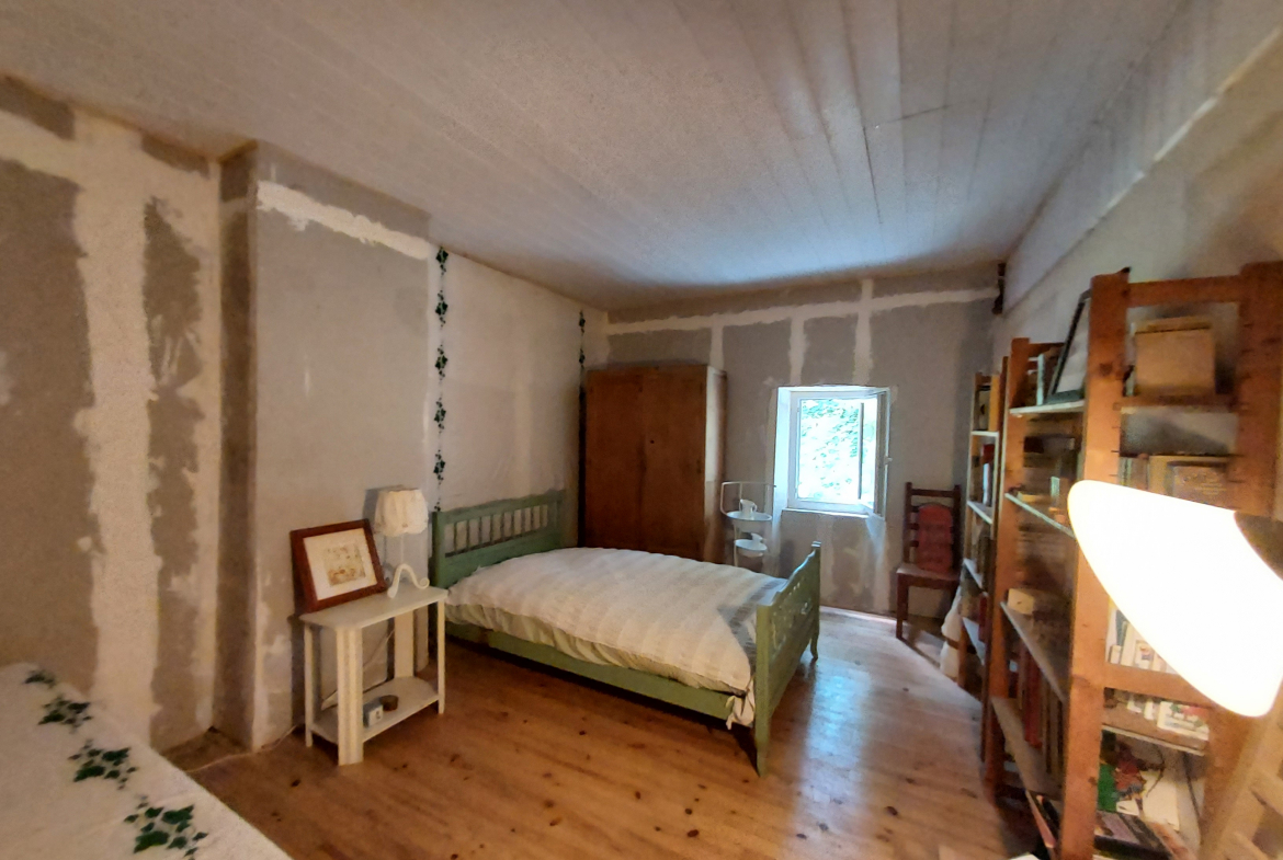 Pour la seconde partie, à finir de rénover, une grande pièce avec cheminée, pièce d’eau. A l’étage, deux chambres, une pièce, sale d’eau avec WC