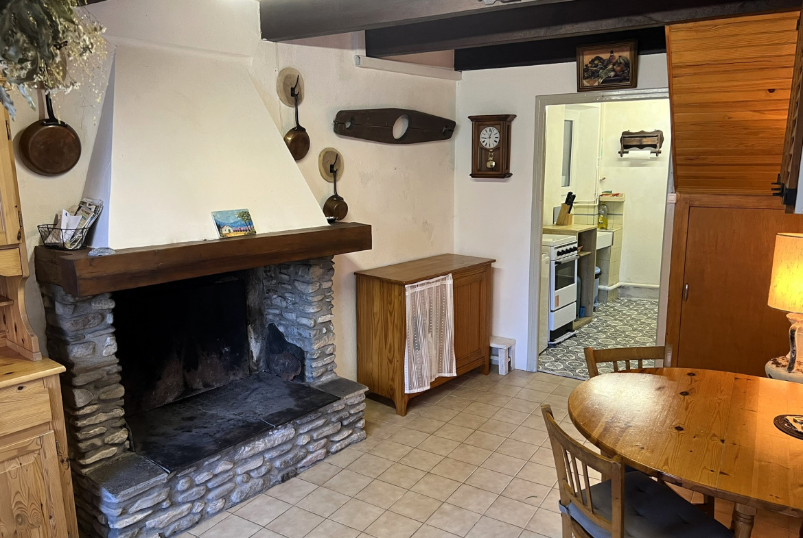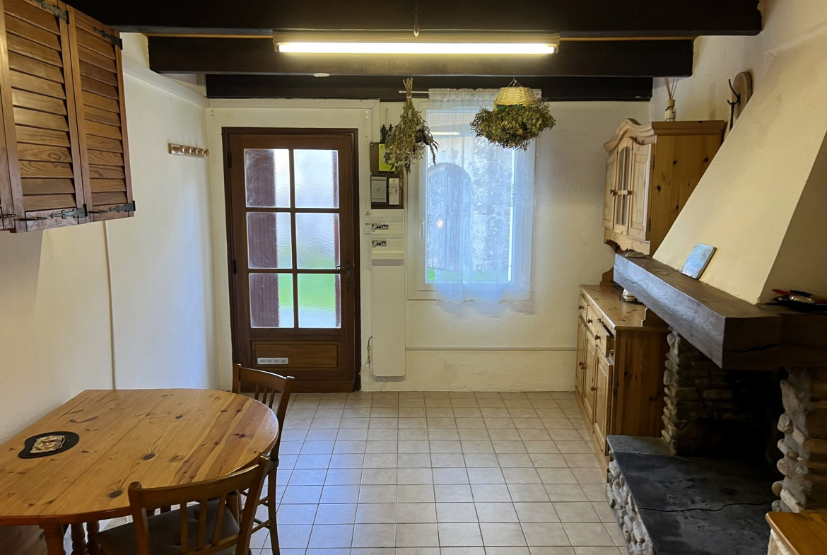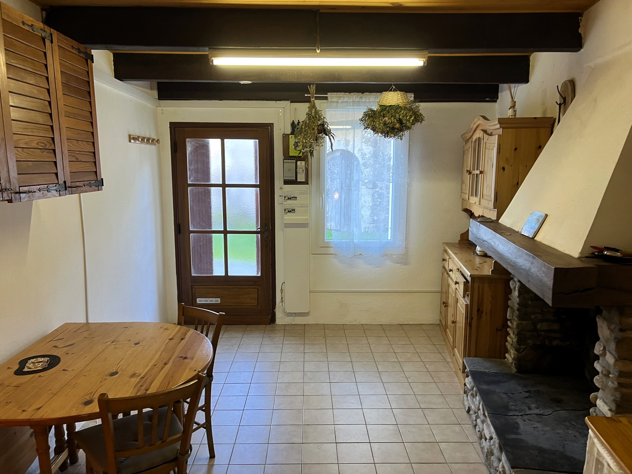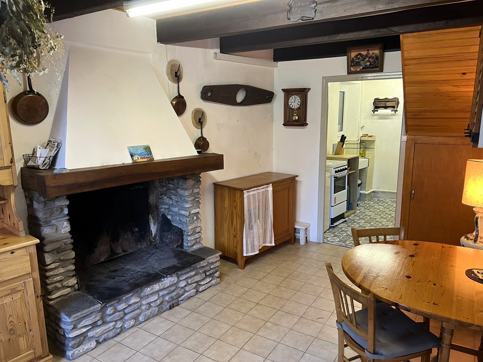 -En rez-de-chaussée: une pièce à vivre avec cheminée donnant sur le coin cuisine.